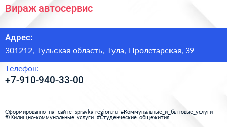Вираж, автосервис по адресу 301212, Тульская область, Тула, Пролетарская, 39 в дальнейшем Организация, размещена в следующих категориях: