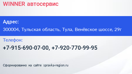 WINNER, автосервис по адресу 300004, Тульская область, Тула, Венёвское шоссе, 29г в дальнейшем Организация, размещена в следующих категориях: