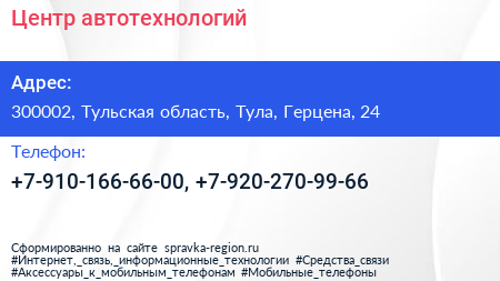Центр автотехнологий по адресу 300002, Тульская область, Тула, Герцена, 24 в дальнейшем Организация, размещена в следующих категориях: