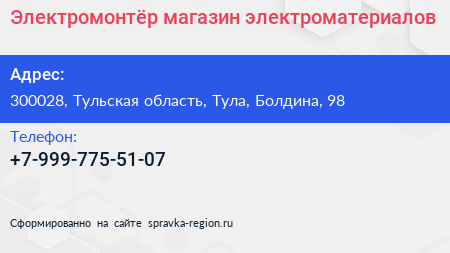 Электромонтёр, магазин электроматериалов по адресу 300028, Тульская область, Тула, Болдина, 98 в дальнейшем Организация, размещена в следующих категориях: