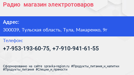 Радио+, магазин электротоваров по адресу 300039, Тульская область, Тула, Макаренко, 9г в дальнейшем Организация, размещена в следующих категориях: