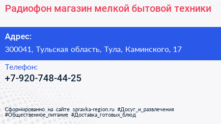 Радиофон, магазин мелкой бытовой техники по адресу 300041, Тульская область, Тула, Каминского, 17 в дальнейшем Организация, размещена в следующих категориях: