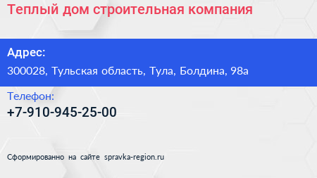 Теплый дом, строительная компания по адресу 300028, Тульская область, Тула, Болдина, 98а в дальнейшем Организация, размещена в следующих категориях: