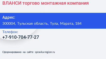 ВЛАНСИ, торгово-монтажная компания по адресу 300004, Тульская область, Тула, Марата, 184 в дальнейшем Организация, размещена в следующих категориях: