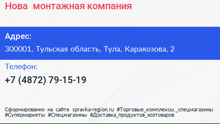 Нова+, монтажная компания по адресу 300001, Тульская область, Тула, Каракозова, 2 в дальнейшем Организация, размещена в следующих категориях: