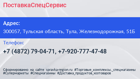 ПоставкаСпецСервис по адресу 300057, Тульская область, Тула, Железнодорожная, 51Б в дальнейшем Организация, размещена в следующих категориях: