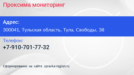 Проксима-мониторинг по адресу 300041, Тульская область, Тула, Свободы, 38 в дальнейшем Организация, размещена в следующих категориях: