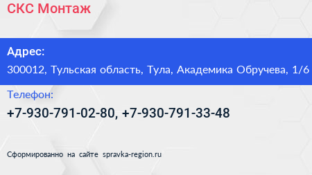 СКС Монтаж по адресу 300012, Тульская область, Тула, Академика Обручева, 1/6 в дальнейшем Организация, размещена в следующих категориях: