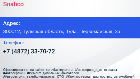 Snabco по адресу 300012, Тульская область, Тула, Первомайская, 3а в дальнейшем Организация, размещена в следующих категориях: