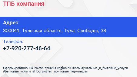 ТПБ, компания по адресу 300041, Тульская область, Тула, Свободы, 38 в дальнейшем Организация, размещена в следующих категориях: