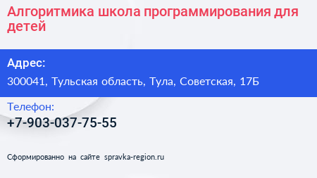 Алгоритмика, школа программирования для детей по адресу 300041, Тульская область, Тула, Советская, 17Б в дальнейшем Организация, размещена в следующих категориях: