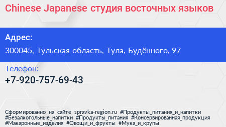 Chinese Japanese, студия восточных языков по адресу 300045, Тульская область, Тула, Будённого, 97 в дальнейшем Организация, размещена в следующих категориях: