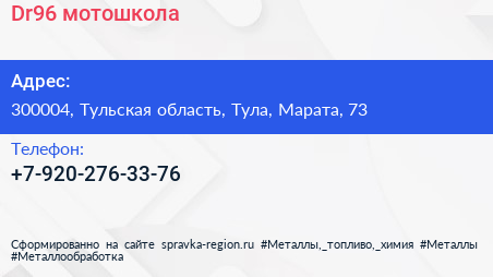 Dr96, мотошкола по адресу 300004, Тульская область, Тула, Марата, 73 в дальнейшем Организация, размещена в следующих категориях: