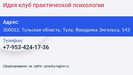 Идея, клуб практической психологии по адресу 300012, Тульская область, Тула, Фридриха Энгельса, 143 в дальнейшем Организация, размещена в следующих категориях: