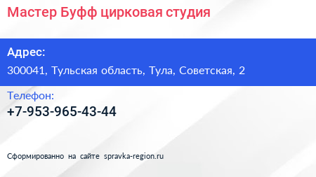 Мастер Буфф, цирковая студия по адресу 300041, Тульская область, Тула, Советская, 2 в дальнейшем Организация, размещена в следующих категориях: