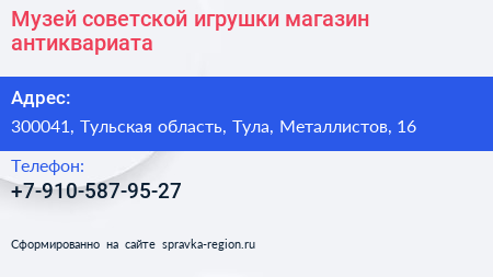Музей советской игрушки, магазин антиквариата по адресу 300041, Тульская область, Тула, Металлистов, 16 в дальнейшем Организация, размещена в следующих категориях: