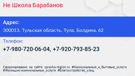 Не Школа Барабанов по адресу 300013, Тульская область, Тула, Болдина, 62 в дальнейшем Организация, размещена в следующих категориях: