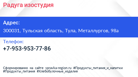 Радуга, изостудия по адресу 300031, Тульская область, Тула, Металлургов, 98а в дальнейшем Организация, размещена в следующих категориях: