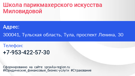 Школа парикмахерского искусства Миловидовой по адресу 300041, Тульская область, Тула, проспект Ленина, 30 в дальнейшем Организация, размещена в следующих категориях: