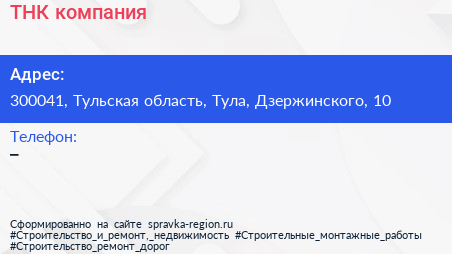 ТНК, компания по адресу 300041, Тульская область, Тула, Дзержинского, 10 в дальнейшем Организация, размещена в следующих категориях: