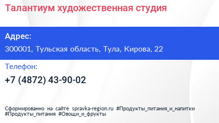 Талантиум, художественная студия по адресу 300001, Тульская область, Тула, Кирова, 22 в дальнейшем Организация, размещена в следующих категориях: