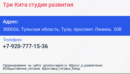 Три Кита, студия развития по адресу 300026, Тульская область, Тула, проспект Ленина, 108 в дальнейшем Организация, размещена в следующих категориях: