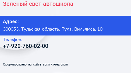 Зелёный свет, автошкола по адресу 300053, Тульская область, Тула, Вильямса, 10 в дальнейшем Организация, размещена в следующих категориях:
