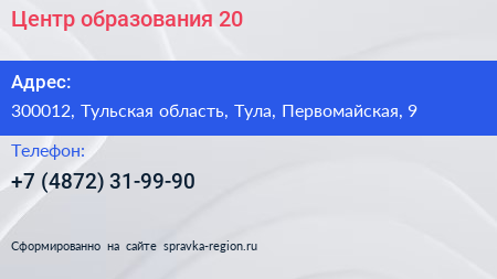Центр образования №20 по адресу 300012, Тульская область, Тула, Первомайская, 9 в дальнейшем Организация, размещена в следующих категориях: