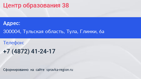Центр образования №38 по адресу 300004, Тульская область, Тула, Глинки, 6а в дальнейшем Организация, размещена в следующих категориях: