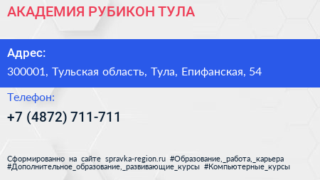 АКАДЕМИЯ РУБИКОН - ТУЛА по адресу 300001, Тульская область, Тула, Епифанская, 54 в дальнейшем Организация, размещена в следующих категориях: