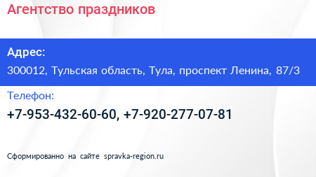Агентство праздников по адресу 300012, Тульская область, Тула, проспект Ленина, 87/3 в дальнейшем Организация, размещена в следующих категориях: