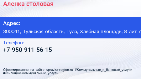 Аленка, столовая по адресу 300041, Тульская область, Тула, Хлебная площадь, 8 лит А в дальнейшем Организация, размещена в следующих категориях: