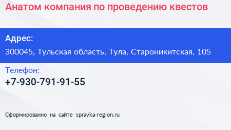 Анатом, компания по проведению квестов по адресу 300045, Тульская область, Тула, Староникитская, 105 в дальнейшем Организация, размещена в следующих категориях: