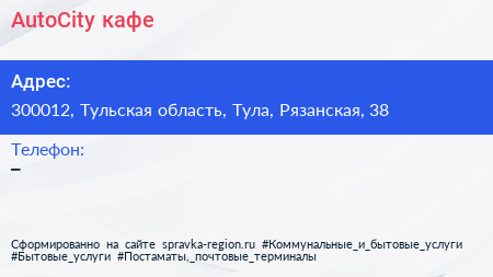 AutoCity, кафе по адресу 300012, Тульская область, Тула, Рязанская, 38 в дальнейшем Организация, размещена в следующих категориях: