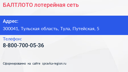 БАЛТЛОТО, лотерейная сеть по адресу 300041, Тульская область, Тула, Путейская, 5 в дальнейшем Организация, размещена в следующих категориях: