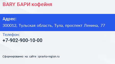 BARY | БАРИ, кофейня по адресу 300012, Тульская область, Тула, проспект Ленина, 77 в дальнейшем Организация, размещена в следующих категориях: