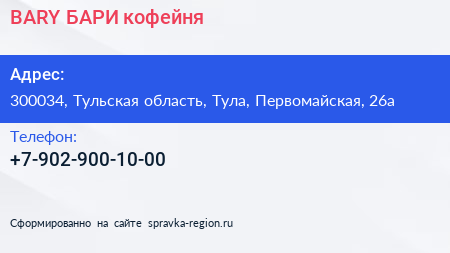 BARY | БАРИ, кофейня по адресу 300034, Тульская область, Тула, Первомайская, 26а в дальнейшем Организация, размещена в следующих категориях: