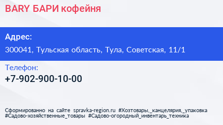 BARY | БАРИ, кофейня по адресу 300041, Тульская область, Тула, Советская, 11/1 в дальнейшем Организация, размещена в следующих категориях: