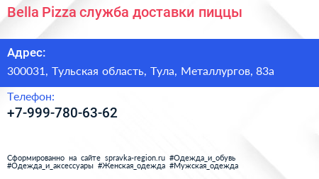 Bella Pizza, служба доставки пиццы по адресу 300031, Тульская область, Тула, Металлургов, 83а в дальнейшем Организация, размещена в следующих категориях: