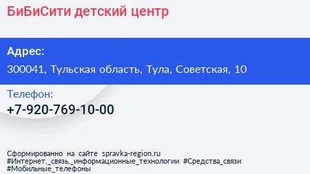 БиБиСити, детский центр по адресу 300041, Тульская область, Тула, Советская, 10 в дальнейшем Организация, размещена в следующих категориях: