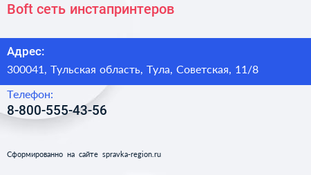 Boft, сеть инстапринтеров по адресу 300041, Тульская область, Тула, Советская, 11/8 в дальнейшем Организация, размещена в следующих категориях: