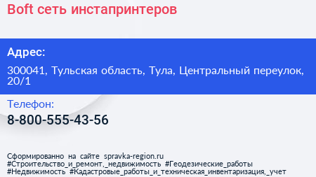 Boft, сеть инстапринтеров по адресу 300041, Тульская область, Тула, Центральный переулок, 20/1 в дальнейшем Организация, размещена в следующих категориях: