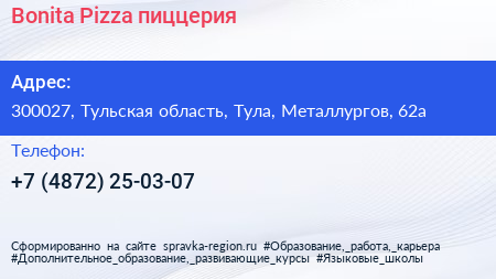 Bonita Pizza, пиццерия по адресу 300027, Тульская область, Тула, Металлургов, 62а в дальнейшем Организация, размещена в следующих категориях: