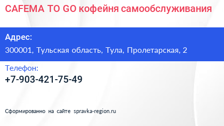 CAFEMA TO GO, кофейня самообслуживания по адресу 300001, Тульская область, Тула, Пролетарская, 2 в дальнейшем Организация, размещена в следующих категориях: