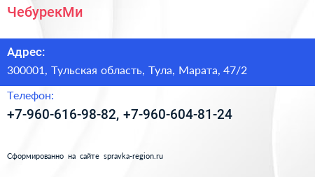 ЧебурекМи по адресу 300001, Тульская область, Тула, Марата, 47/2 в дальнейшем Организация, размещена в следующих категориях: