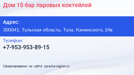 Дом 15, бар паровых коктейлей по адресу 300041, Тульская область, Тула, Каминского, 24в в дальнейшем Организация, размещена в следующих категориях: