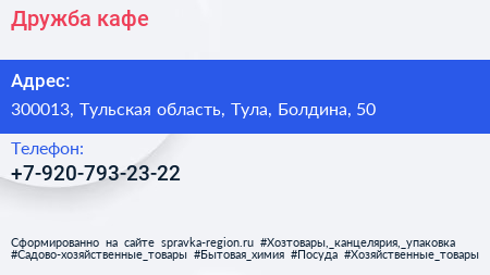 Дружба, кафе по адресу 300013, Тульская область, Тула, Болдина, 50 в дальнейшем Организация, размещена в следующих категориях: