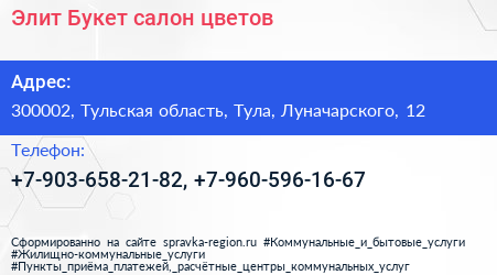 Элит Букет, салон цветов по адресу 300002, Тульская область, Тула, Луначарского, 12 в дальнейшем Организация, размещена в следующих категориях: