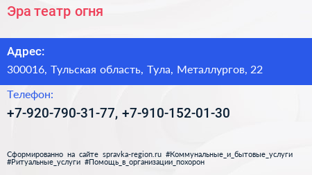 Эра, театр огня по адресу 300016, Тульская область, Тула, Металлургов, 22 в дальнейшем Организация, размещена в следующих категориях: