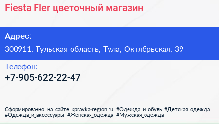 Fiesta Fler, цветочный магазин по адресу 300911, Тульская область, Тула, Октябрьская, 39 в дальнейшем Организация, размещена в следующих категориях: